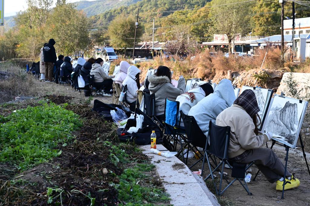 抵达绥中县“关外写生第一村”,师生们被这里的自然与人文景观深深吸引,古朴的村落建筑、层叠的山峦沟壑、蜿蜒的长城遗迹,构成了天然的艺术课堂。师生们或在村落旁的空地上支起画架,以灰砖黛瓦的民居为主体,刻画北方乡村的质朴肌理;或深入山林,以长城烽燧为远景,用笔墨表现山岩的雄浑与草木的灵动。