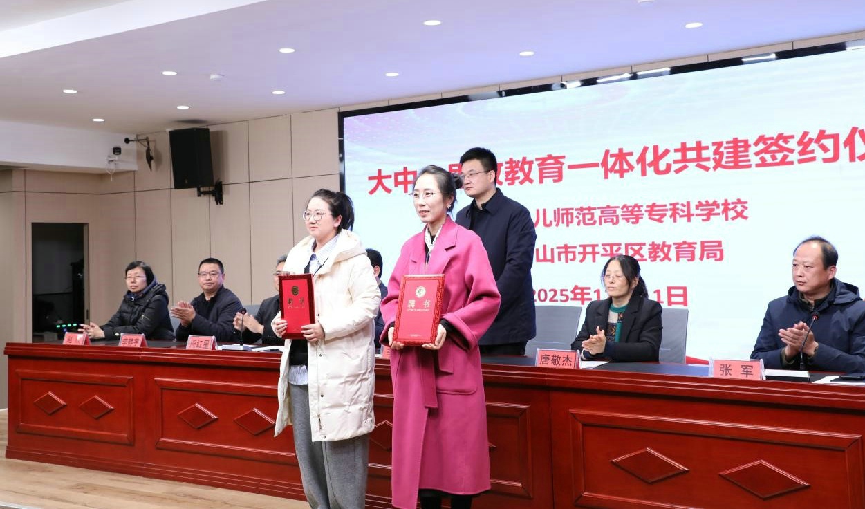 2025年12月11日,唐山幼儿师范高等专科学校、开平区教育局大中小学思政课一体化共建签约仪式在开平区水山樾城学校隆重举行。唐山市委教育工委专职副书记、市教育局党组成员赵乾,开平区人民政府副区长、党组成员李钊,唐山幼专党委委员、副校长周红星等出席活动。